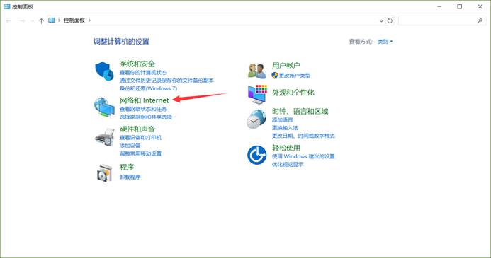 2.在打开的控制面板窗口,选择“网络和Internet项”图标