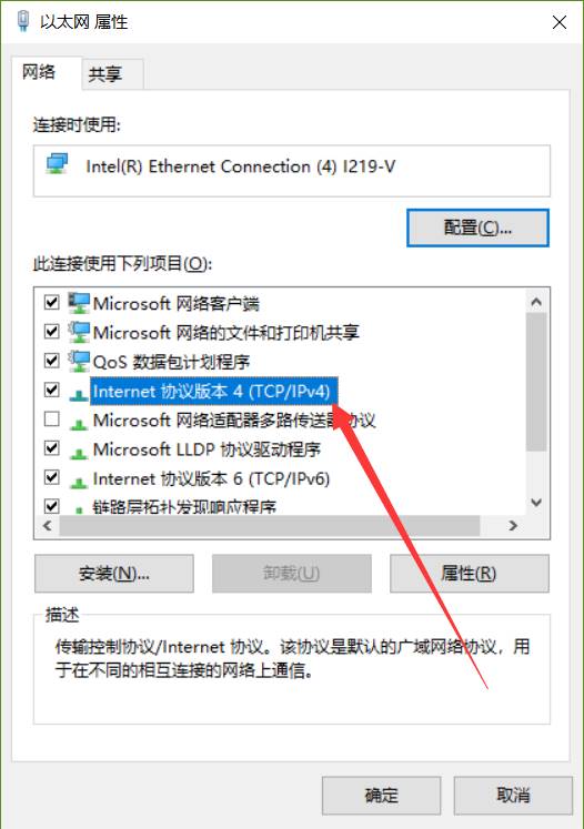 6.在打开的本地连接属性窗口,找到“Internet协议4(TCP/IPV4)”项,双击该项,或是选择后点击“属性”按钮