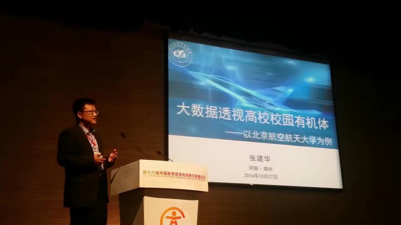 27号,在主题论坛“大数据支撑下的教育变革”上,张建华主任作了“大数据透视下的高校校园有机体—以北京航空航天大学为例”的主题报告,创新地将高校比喻成有机体并提出利用大数据透视“看见不可见”以实现支撑高教变革的目标。报告分享了通过内外部数据以及结构化、非结构化数据透视出学校学生情绪、机关服务作风、部门运行情况、北航社会影响力、北航印象等鲜活案例,首次提出了用大数据的“五行”模型解读高校大数据的方法。最后用“头雁引领,群雁并进”雁群精神结束了报告,指出信息化需要一种坚韧的干劲和多方的合作方能共赢。张建华主任的专题报告通过实践对大数据如何支撑高校变革进行了深度分析,引起参会同行的强烈共鸣,得到与会专家的高度肯定。