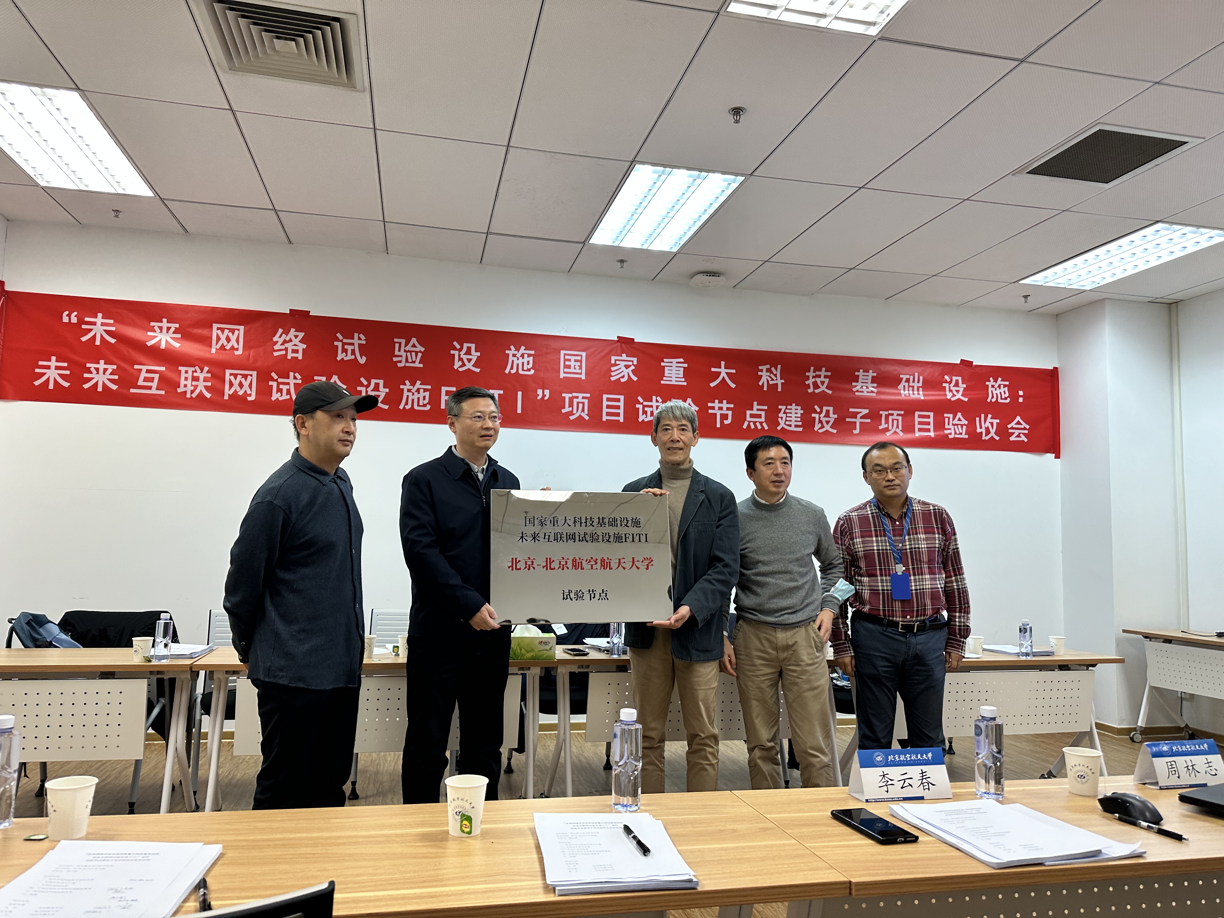 随后,专家组对于项目建设的情况进行了现场参观,对北京航空航天大学在“未来网络试验设施国家重大科技基础设施:未来互联网试验设施FITI”子项目目前取得的成效给予了充分肯定与高度评价,一致认为,该项目目前不仅按照合同要求优质完成了建设内容、达成了预期目标;更在配套机房环境超额完成预定目标,本地试验网络建设特色突出、卓有成效。最终专家组一致决定通过验收,并为本项目组颁发了“国家重大科技基础设施未来互联网试验设施FITI 北京-北京航空航天大学试验节点”牌匾,祝贺项目顺利竣工。