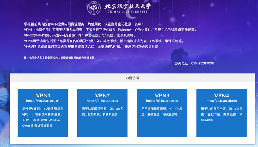 学校提供了4套VPN系统。其中VPN1需要下载客户端使用,用以访问各类资源以及在正版化平台(https://s.buaa.edu.cn/)下载激活各类正版化软件;VPN2、VPN3、VPN4无须下载客户端或插件,可以直接在网页端访问校内资源。