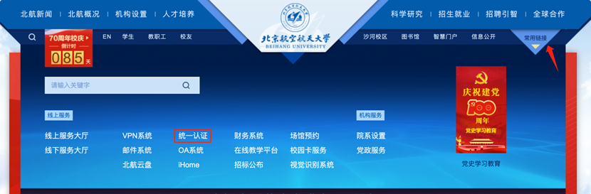 第一步,通过PC端或手机,直接访问https://ucs.buaa.edu.cn/,或者通过北航官网的“常用链接-->统一认证”进入https://ucs.buaa.edu.cn/页面。