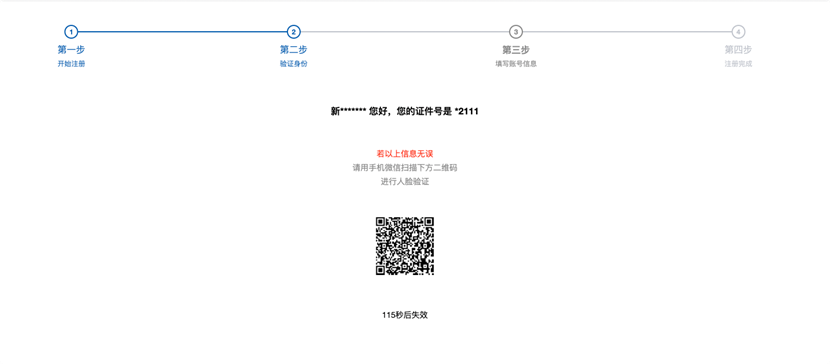 第四步,输入学号和证件号后会跳转至身份验证页面,使用手机微信扫描此二维码进行人脸识别,操作需要在120内完成。